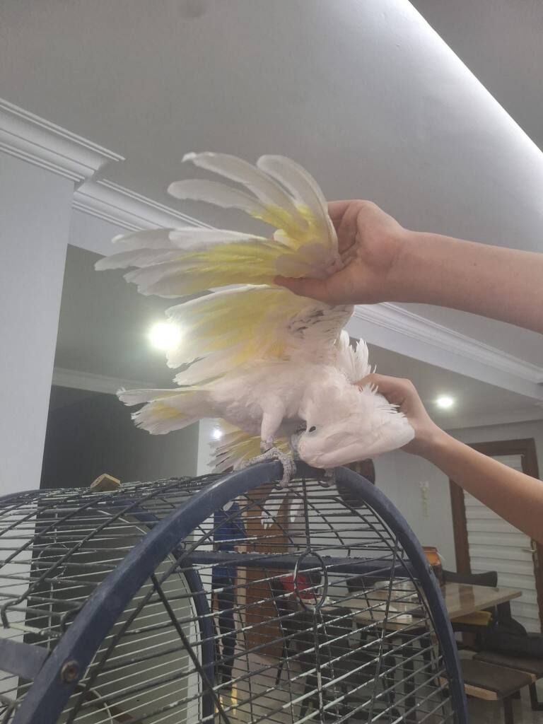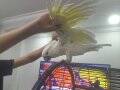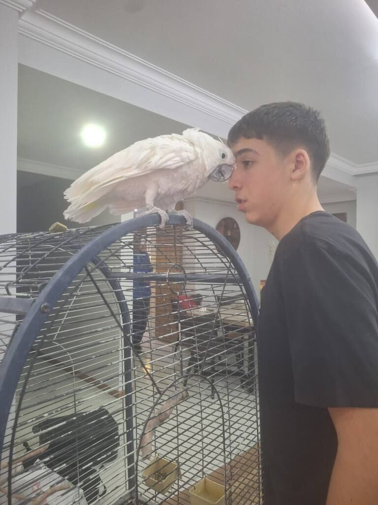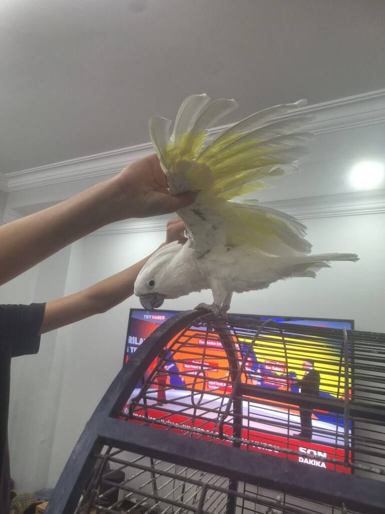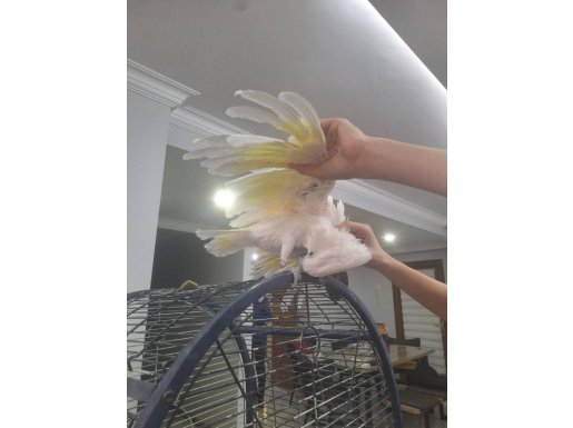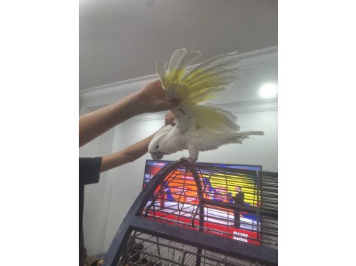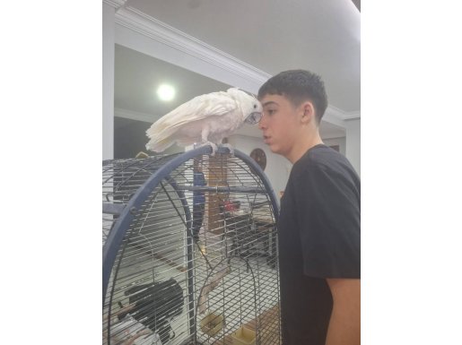 İki yaşında, erkek ve tam evcil olan bu Umbrella Kakadu, insancıl tavırlarıyla aileye hemen uyum sağlar.