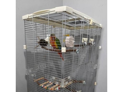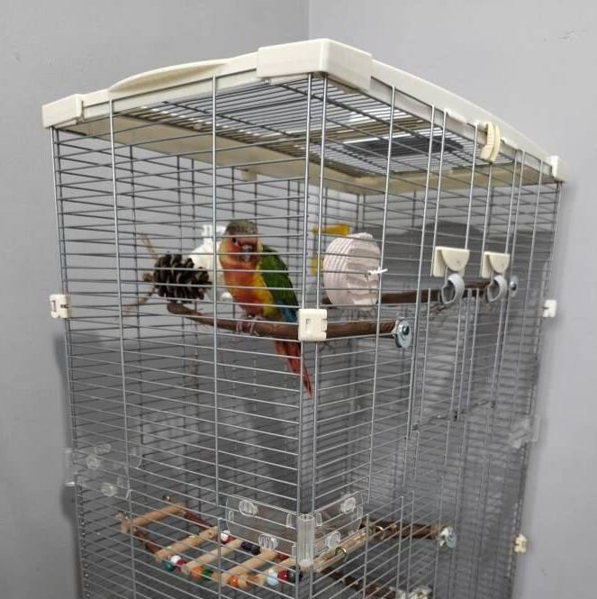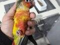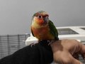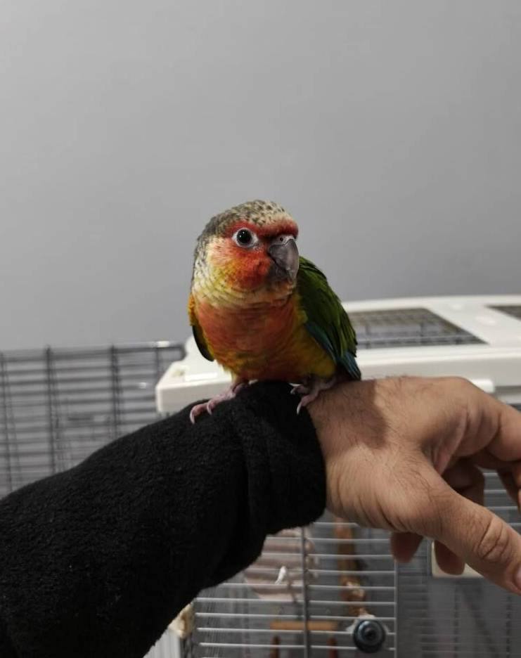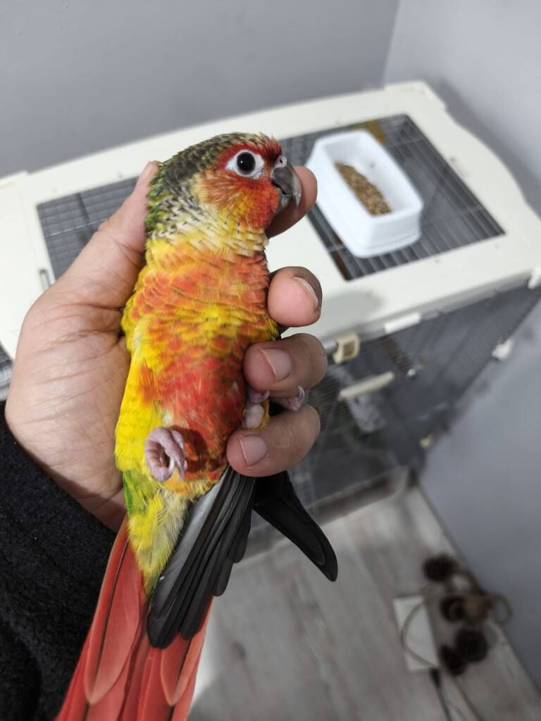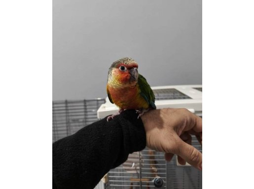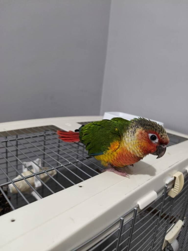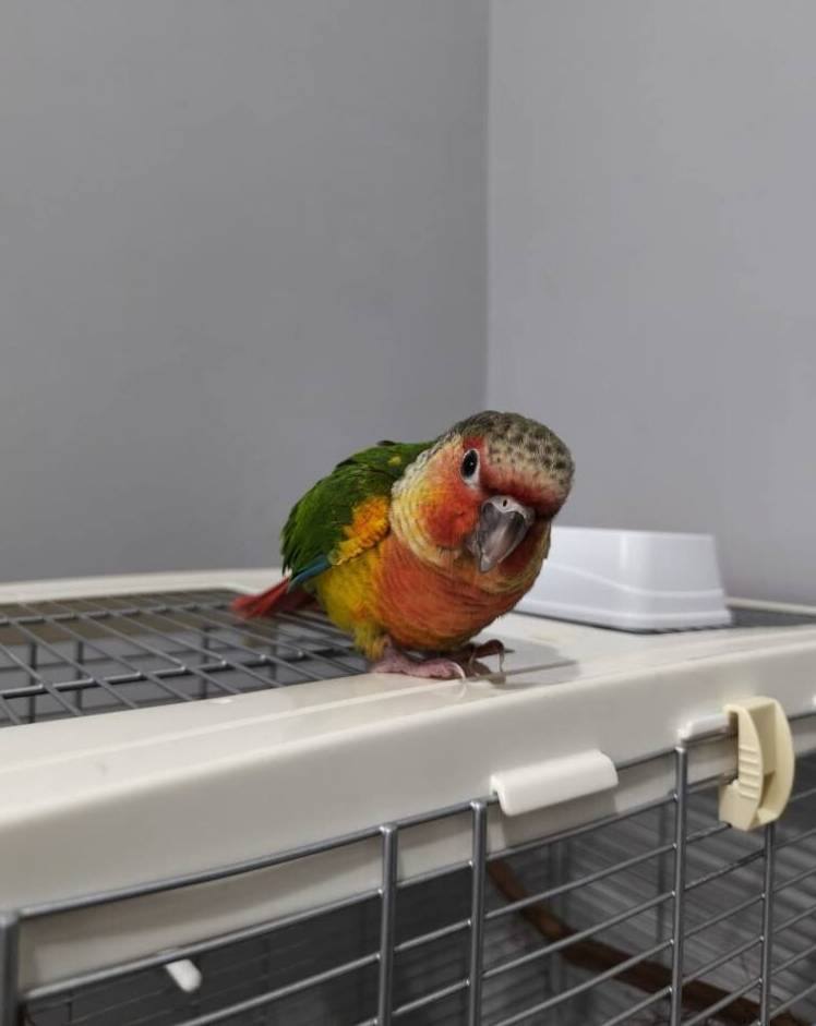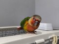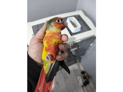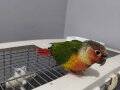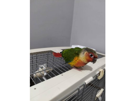 Rengarenk konur papağanı, el besleme olarak büyütüldü, yaklaşık 2 haftadır yem yemeye alıştı.