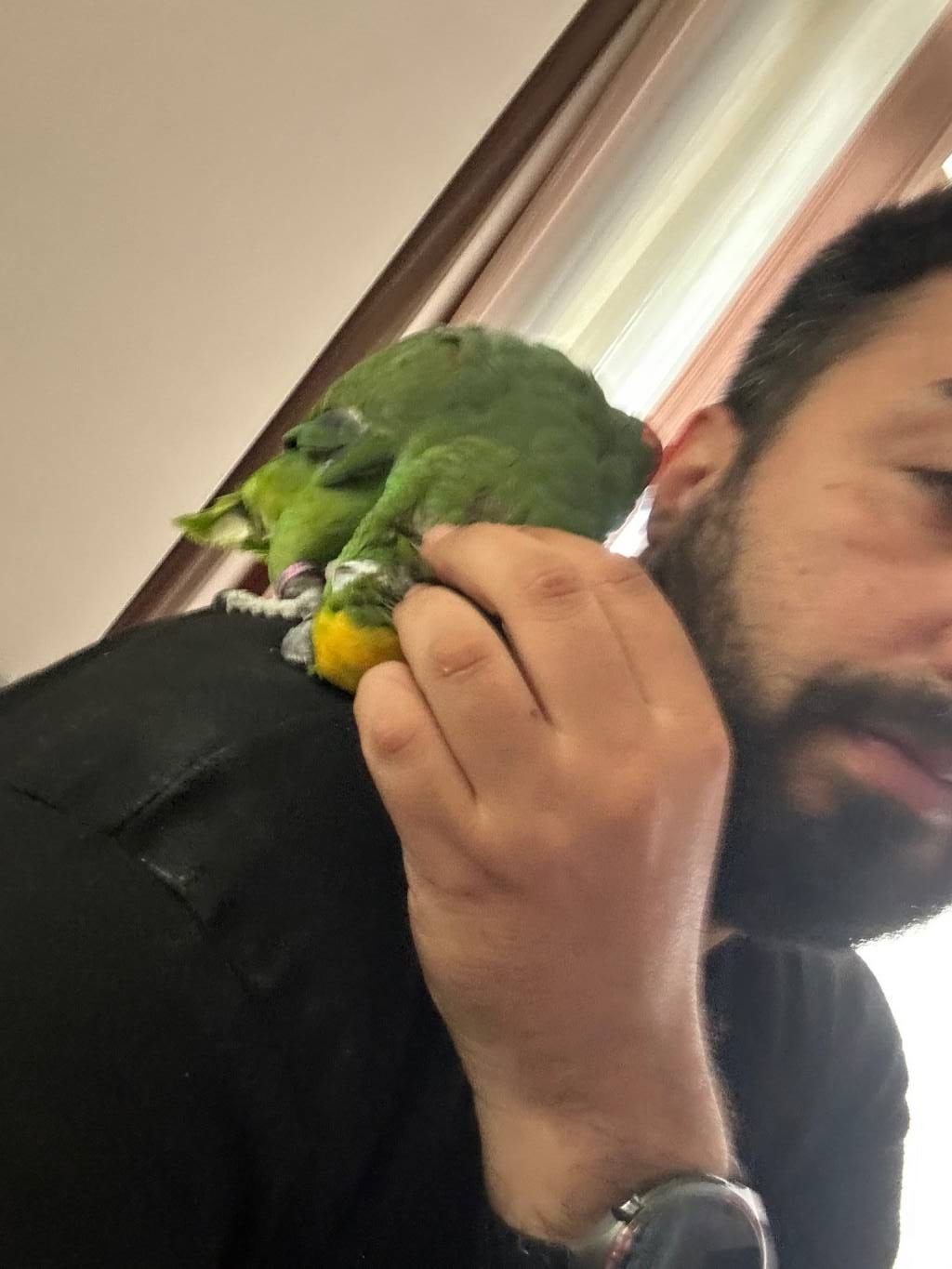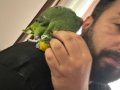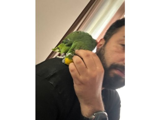 Sarı alın amazon papağanı evcil, omuzdan inmez tam bir can yoldaşıdır.